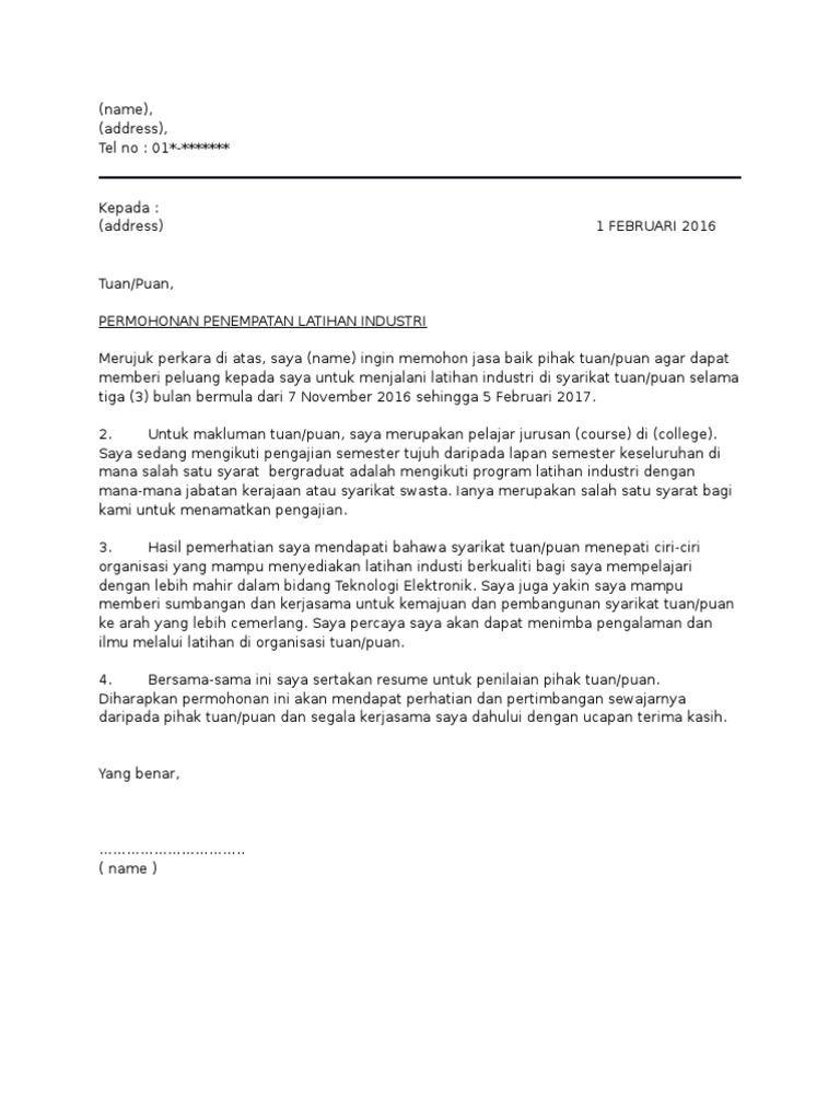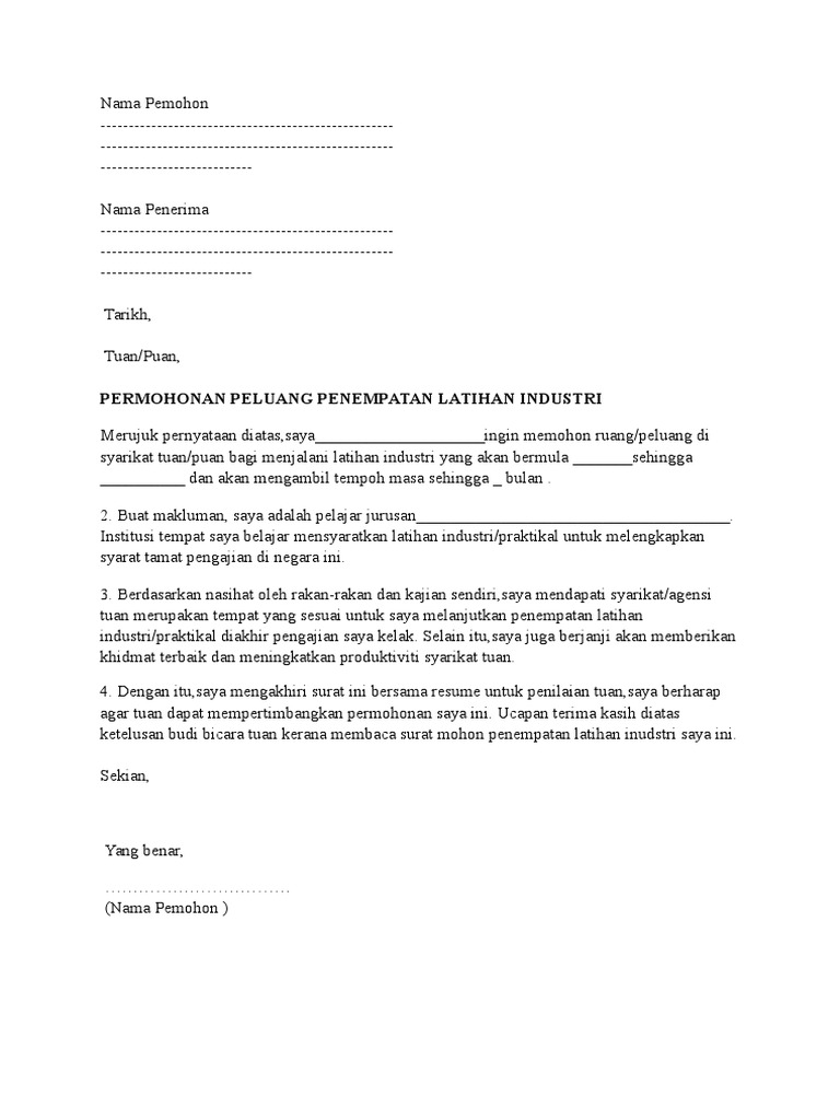 Contoh Surat Permohonan Latihan Industri Latihan Praktikal