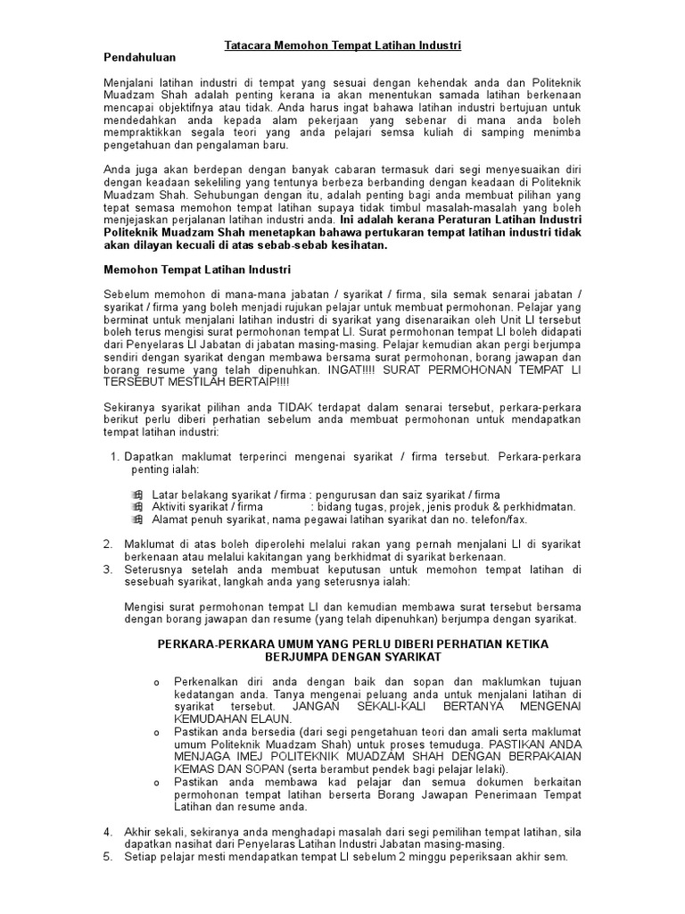 Tatacara Memohon Tempat Latihan Industri Sebelum Li Pdf